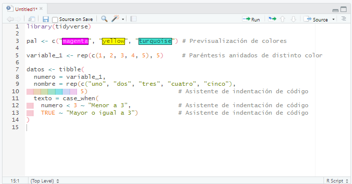 Al escribir en el editor o la consola, la tecla Tab activa el autocompletado de funciones, nombres de objetos y argumentos, agilizando la escritura y reduciendo errores de sintaxis. En versiones recientes, el asistente también permite la previsualización de colores en los gráficos, resaltar los paréntesis de cierre en funciones anidadas con distintos colores y gestionar automáticamente la indentación del código.