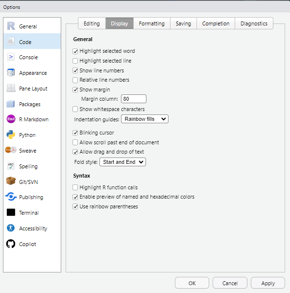 Muchas de estas opciones se pueden configurar desde el menú Code y desde Tools > Global Options > Code(pestañas Editing y Display).
