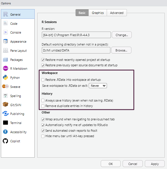 Para garantizar la reproducibilidad de los resultados, es recomendable evitar el guardado automático del historial de objetos entre sesiones, ya que puede generar confusión. Para desactivar esta opción, ir a Tools > Global Options y desmarcar las casillas de las opciones Workspace y History como se muestra en la siguiente imagen: