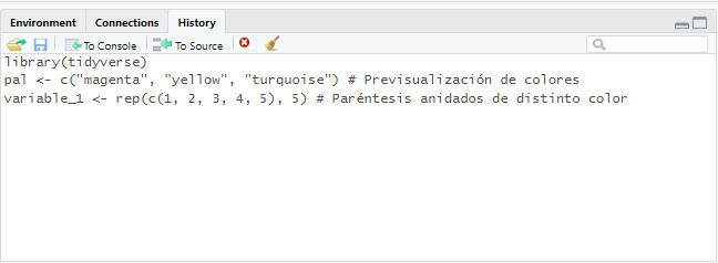 En la consola, al usar las teclas de flecha arriba/abajo, se puede navegar por los comandos ejecutados durante la sesión actual. Además, el panel History (parte superior derecha) almacena los comandos de todas las sesiones previas, permitiendo reutilizarlos con un clic en To Console (Enter) o To Source (Shift + Enter), según se desee insertarlos en la consola o en el script activo.