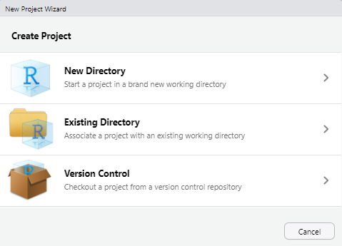 Durante este curso utilizaremos siempre la primera opción (New Project). Las demás opciones están pensadas para usos más específicos, como el desarrollo de paquetes de R, sitios web o documentos con Quarto o R Markdown.