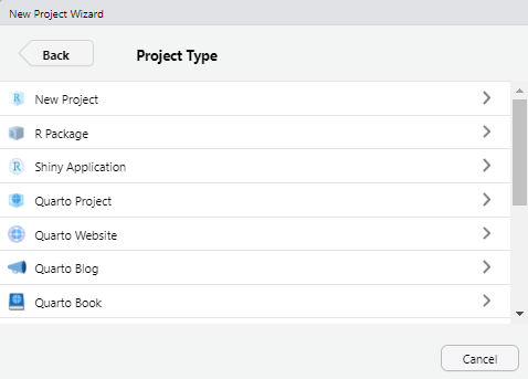 Una vez que creamos un nuevo proyecto con la opción New Directory, aparecerá una pantalla con una lista de tipos de proyectos que se pueden crear en RStudio: