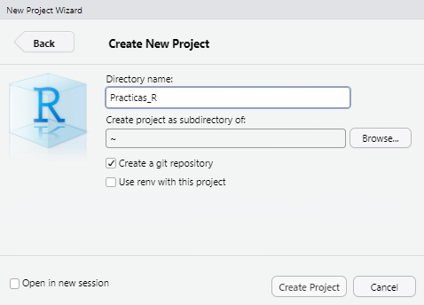 Practicas_R.Create project as subdirectory of: este campo permite definir en qué ubicación del sistema de archivos se guardará el proyecto. Podemos hacer clic en el botón Browse… para abrir el explorador de archivos y seleccionar la carpeta contenedora. En nuestro ejemplo, lo ubicaremos dentro de Mis Documentos.