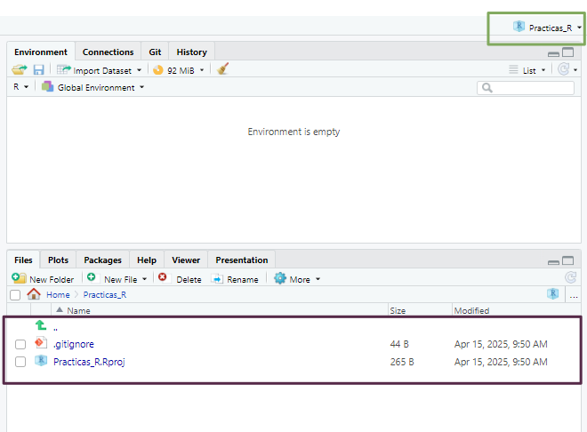 En primer lugar el panel Files (pantalla inferior derecha) apunta a la nueva carpeta Practicas_R y dentro de ella vemos un nuevo archivo el nombre del proyecto y la extensión