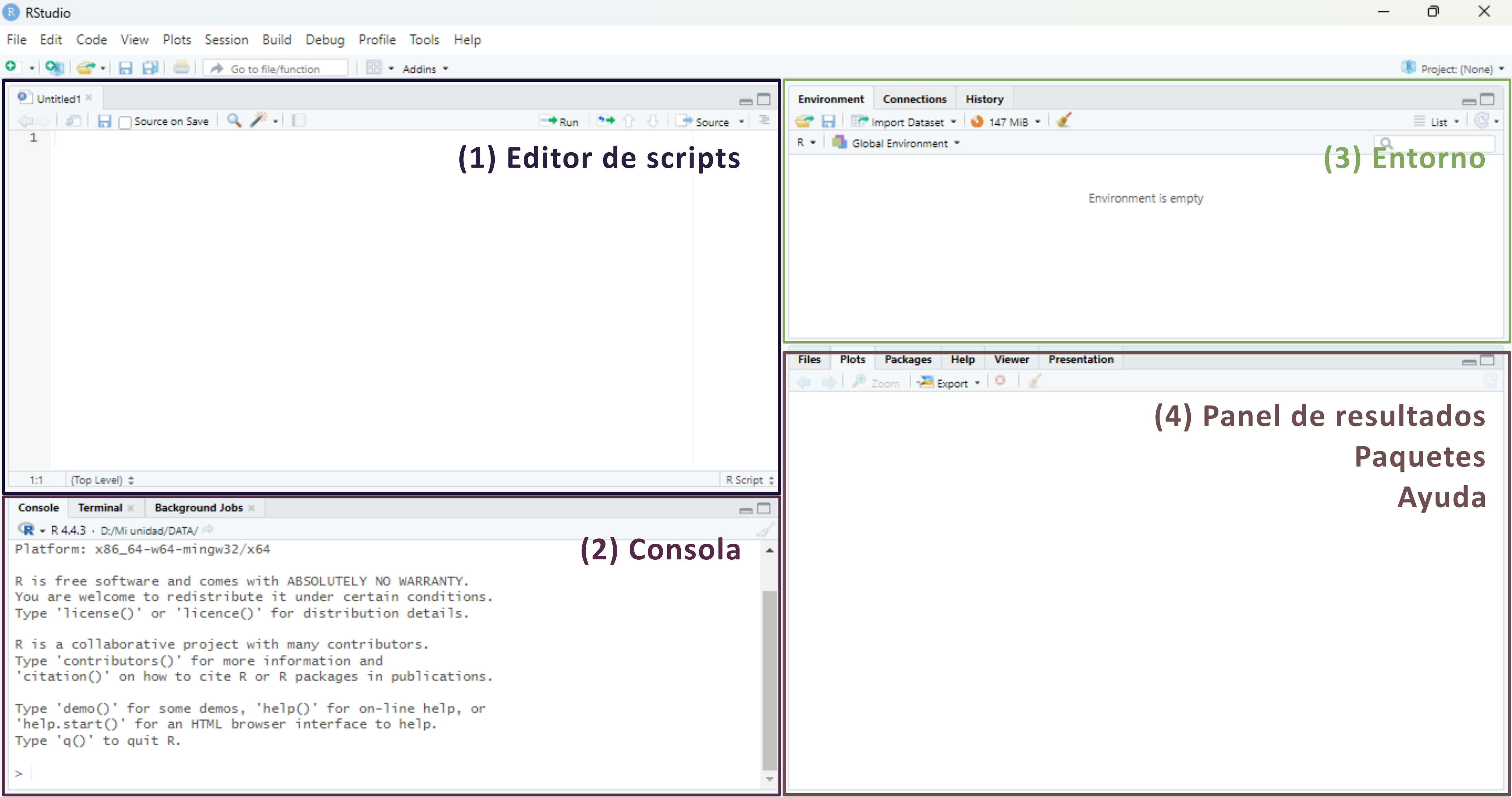Entorno (Environment): muestra los objetos creados durante la sesión, como vectores, dataframes o funciones.