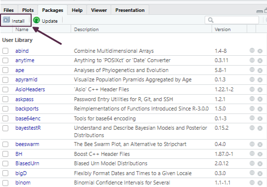 Dentro del entorno de RStudio, la gestión de paquetes se realiza desde la pestaña Packages, ubicada en el panel inferior derecho. Esta interfaz facilita tareas como la instalación, actualización y activación de paquetes, y cada acción que realizamos desde la interfaz gráfica se traduce internamente en la ejecución de funciones del lenguaje R que pueden observarse en la consola.