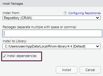 Existen dos formas principales de descargar paquetes: directamente desde RStudio o desde el sitio web de CRAN, descargándolos como archivos comprimidos. Si el equipo cuenta con conexión a Internet, lo más práctico es realizar la descarga directamente desde RStudio. En cambio, si no se dispone de acceso permanente a la red, es posible descargar los paquetes desde otro equipo y luego transferirlos como archivos .zip o .tar.gz al equipo donde se encuentra instalado R.