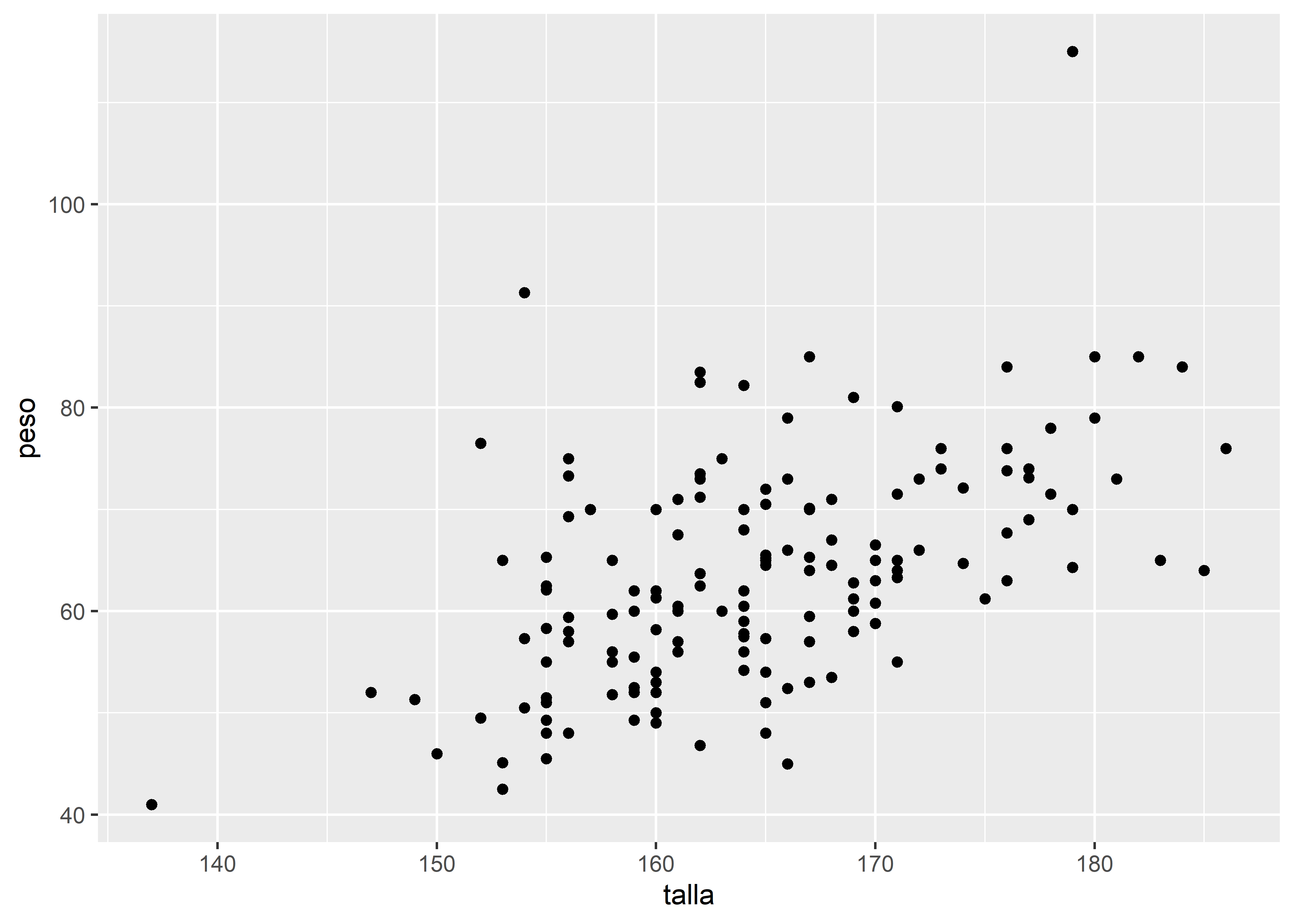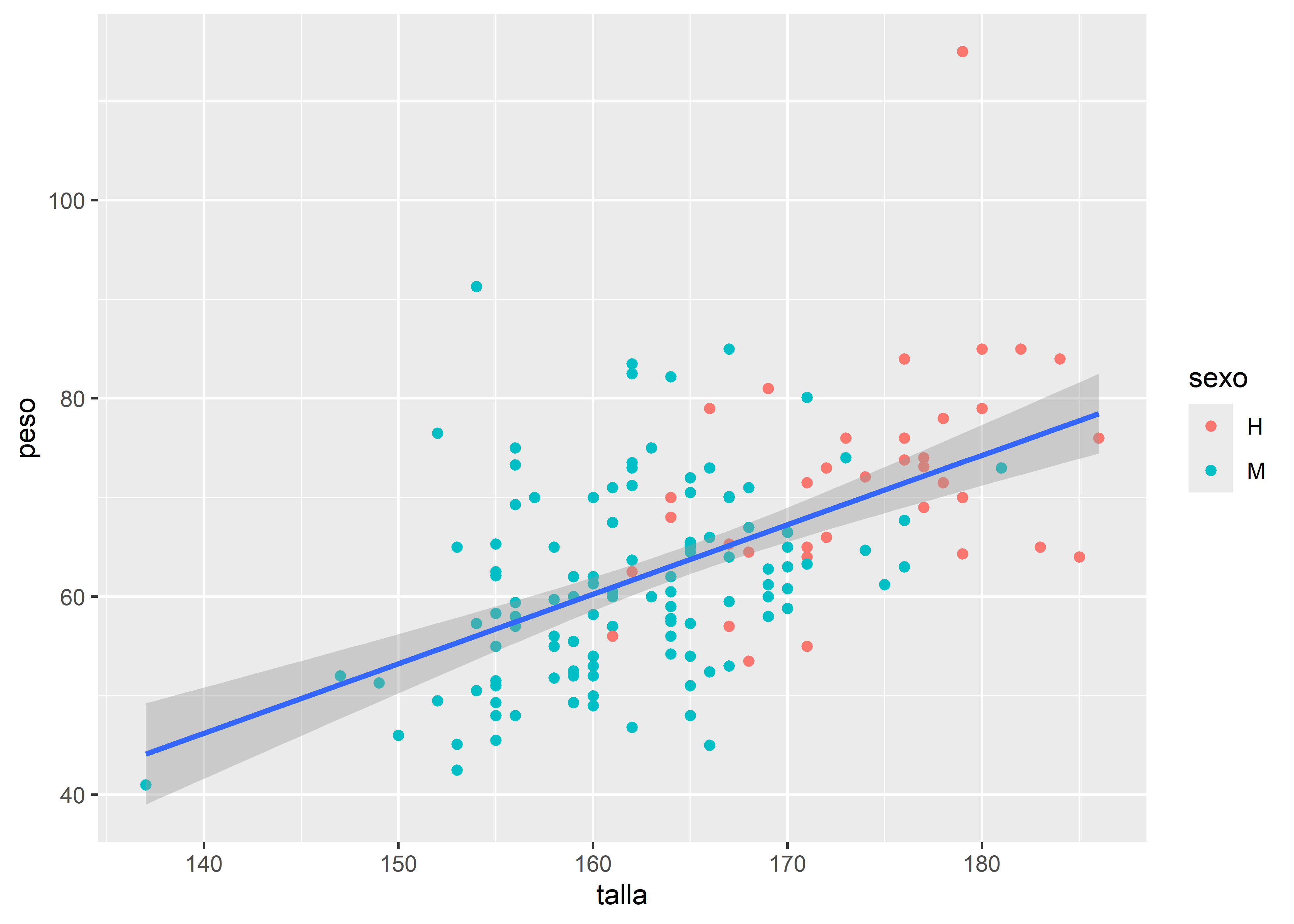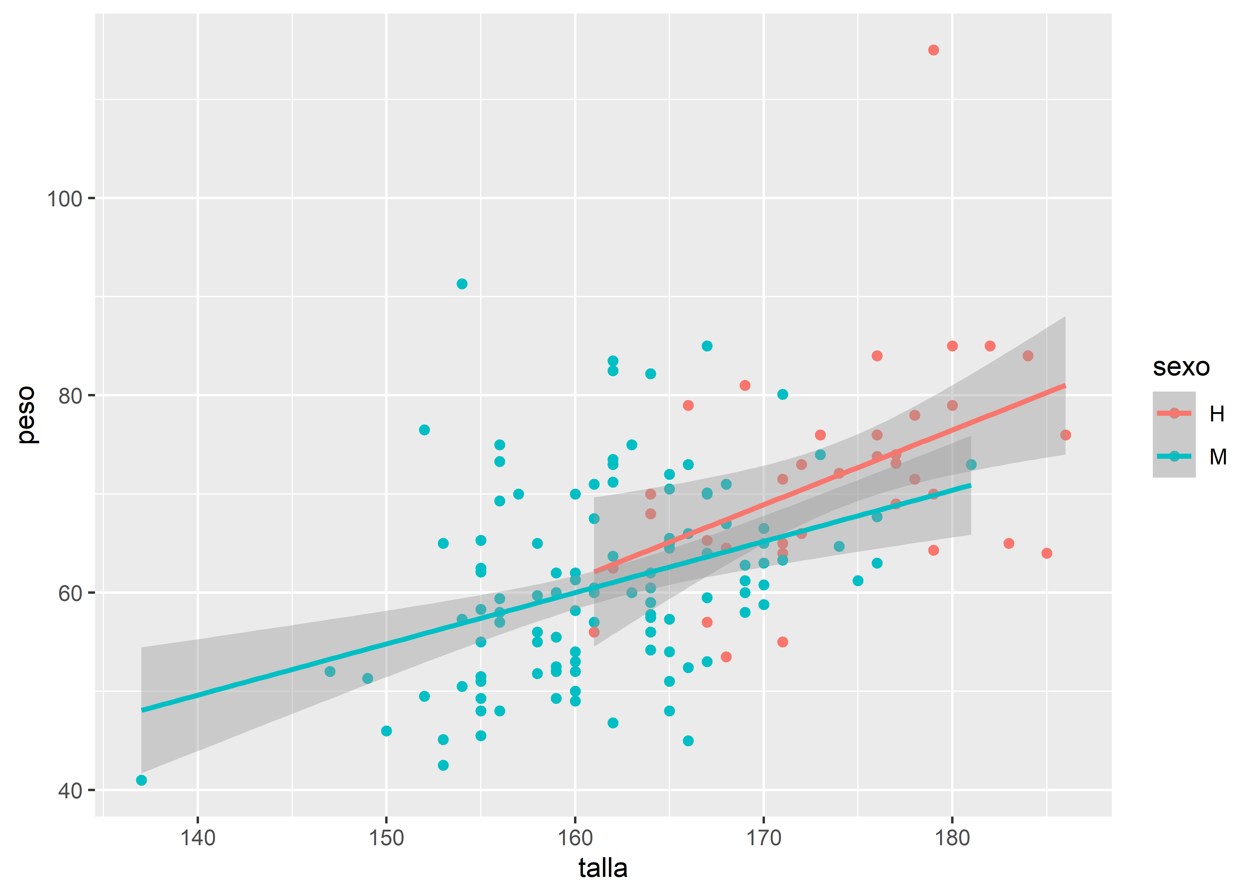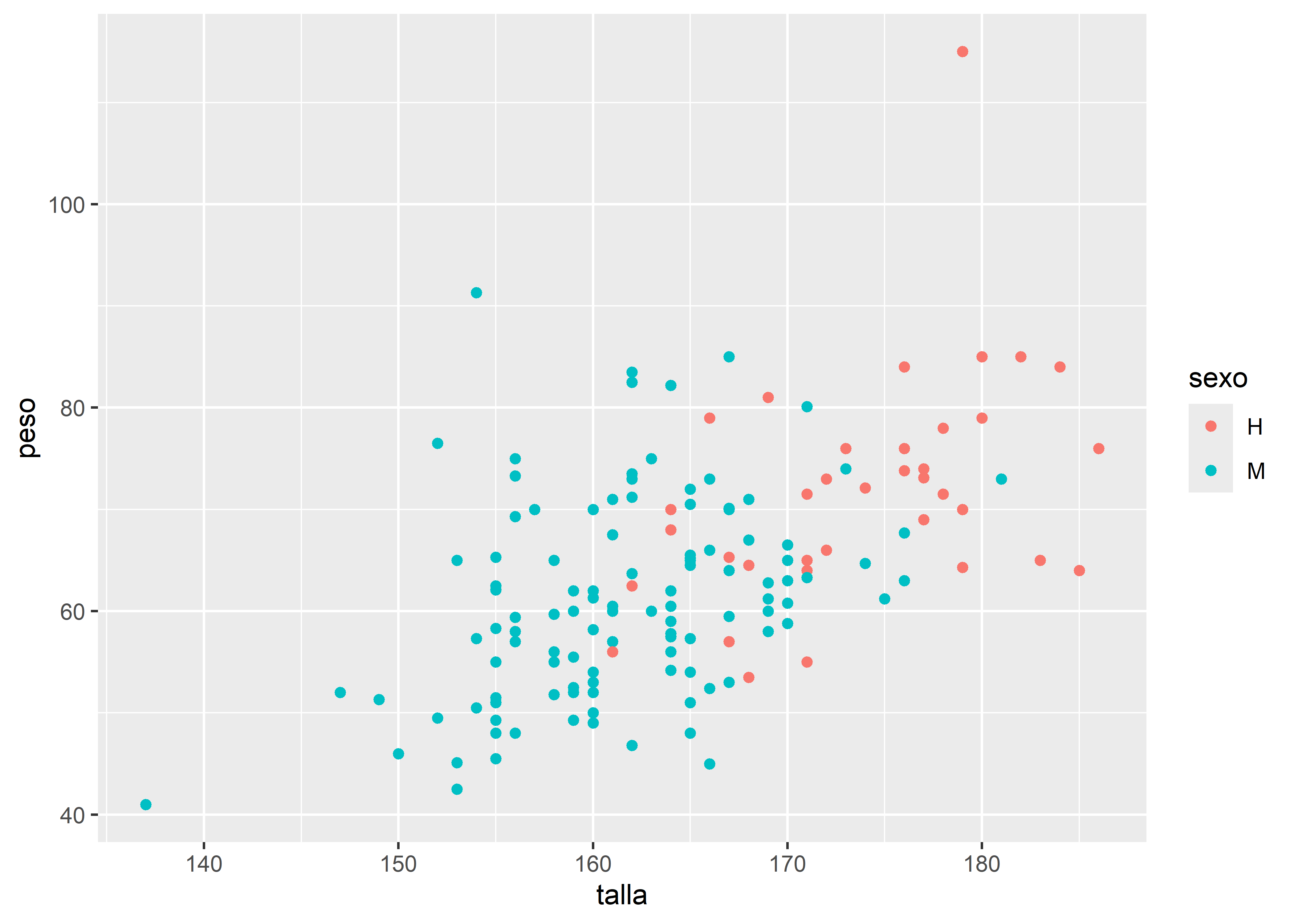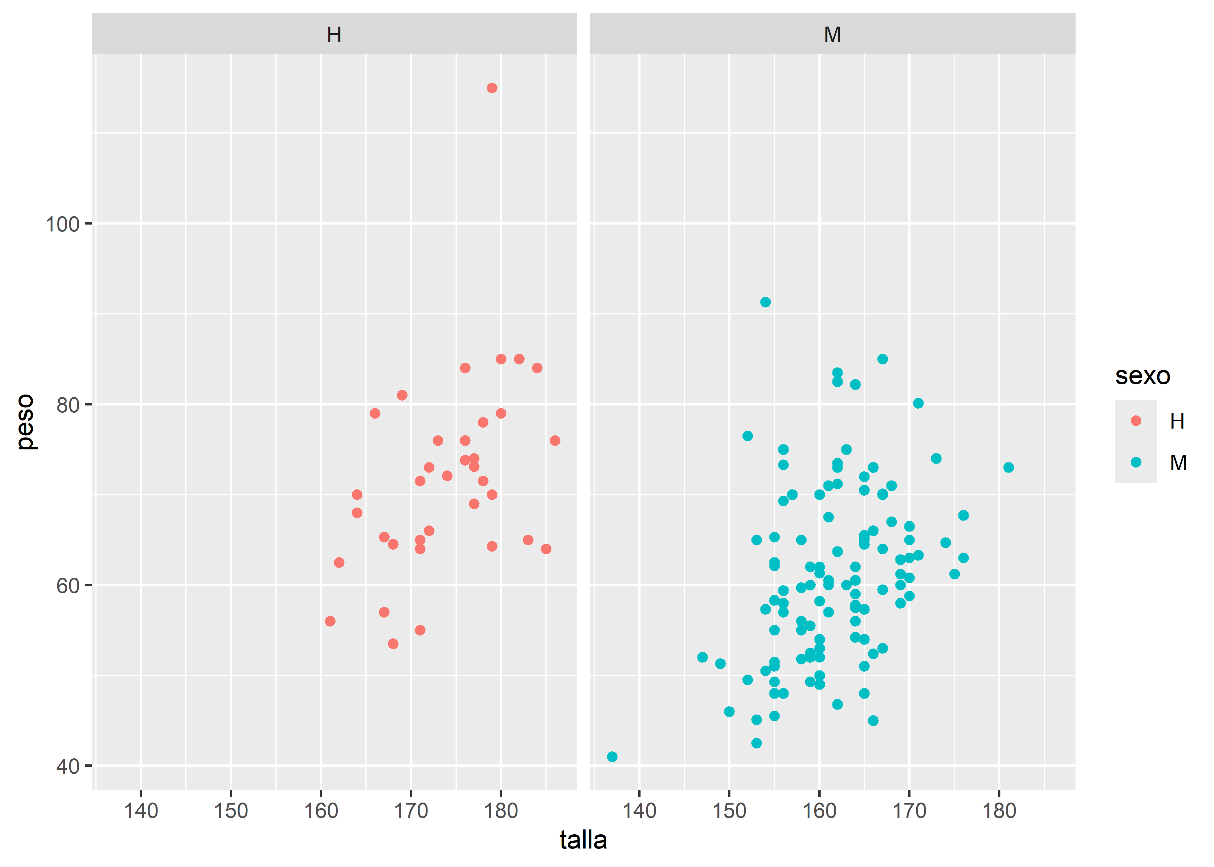 Retomemos el gráfico de dispersión entre talla y peso, y generemos paneles separados para cada nivel de la variable sexo con facet_wrap():