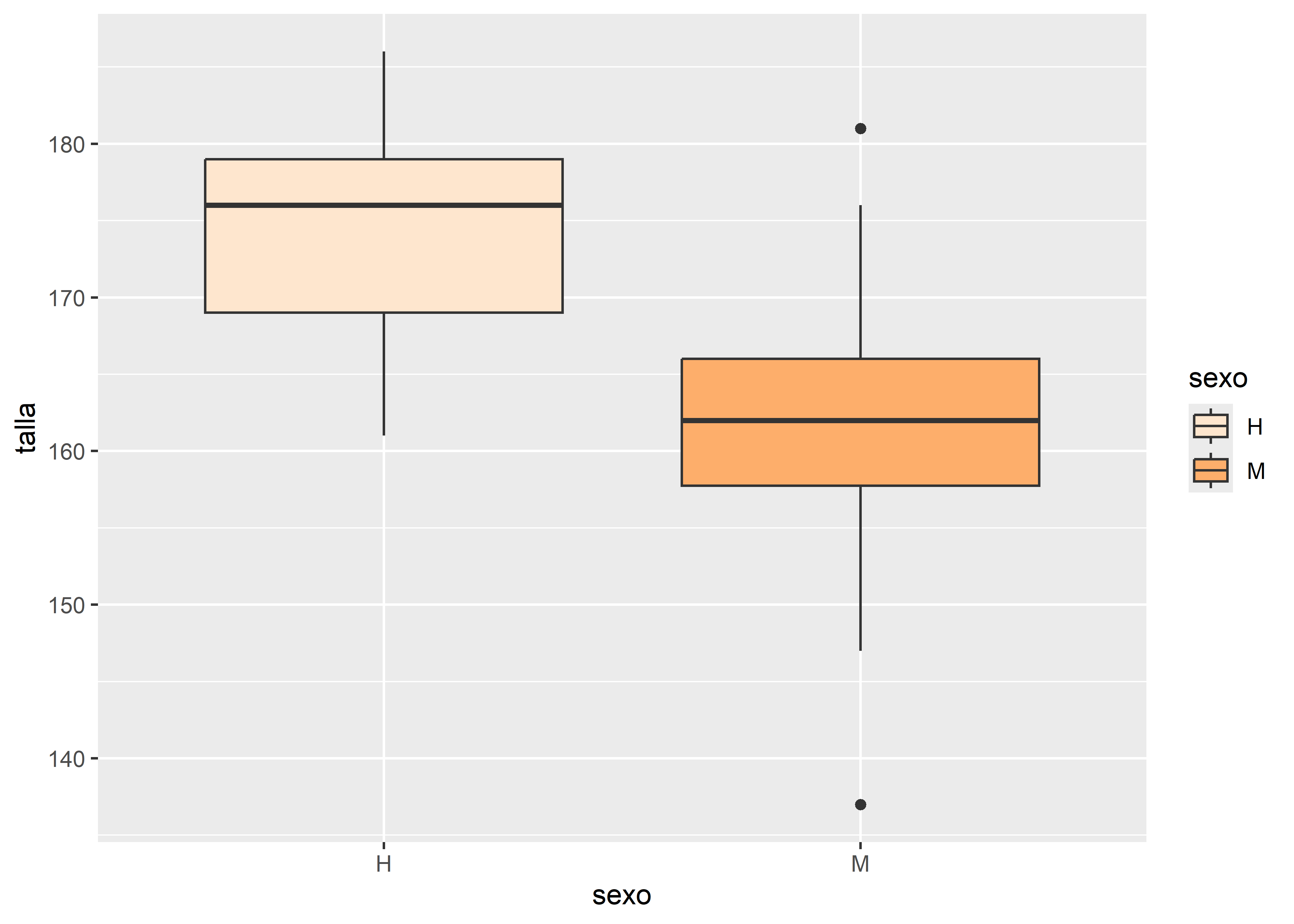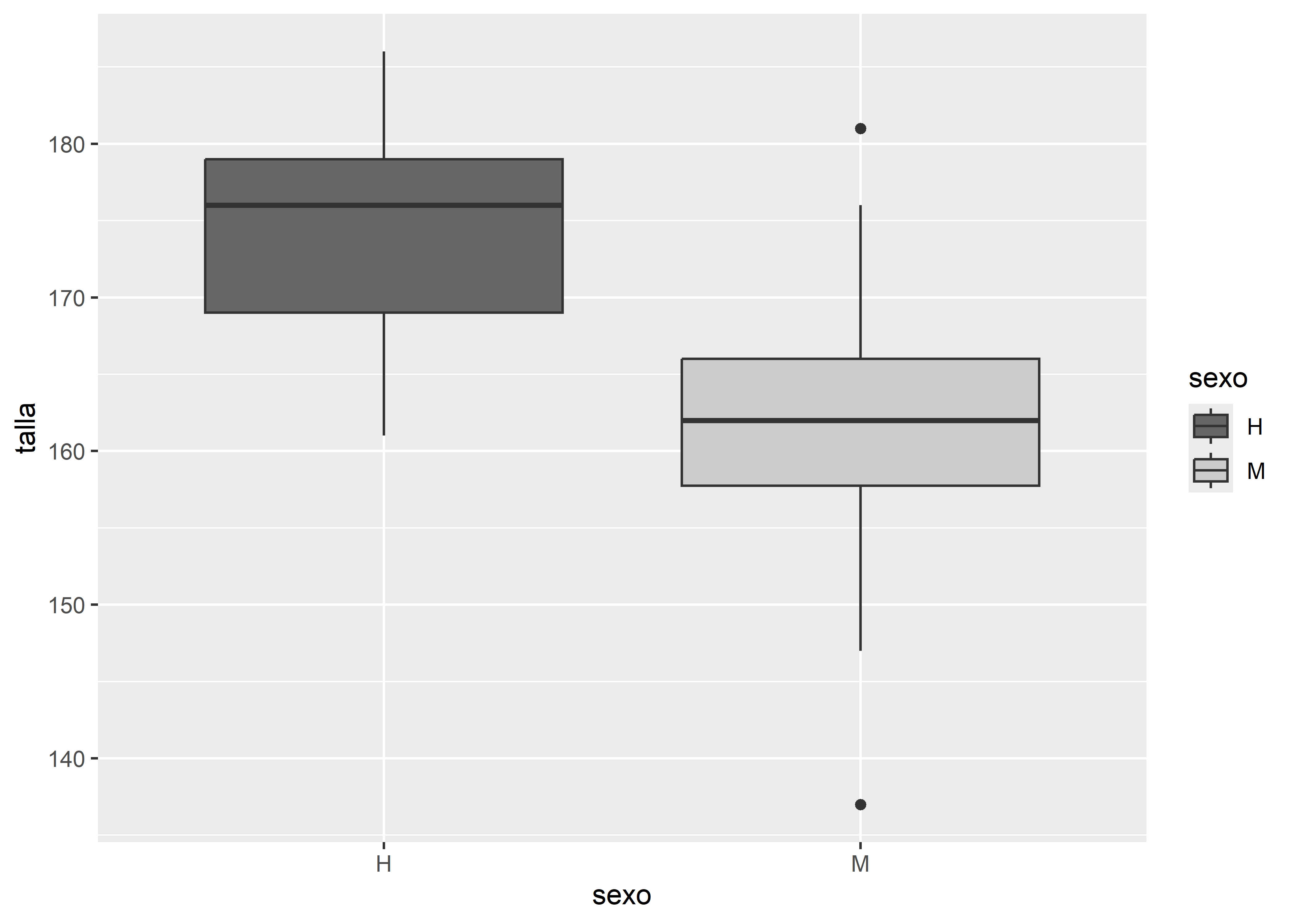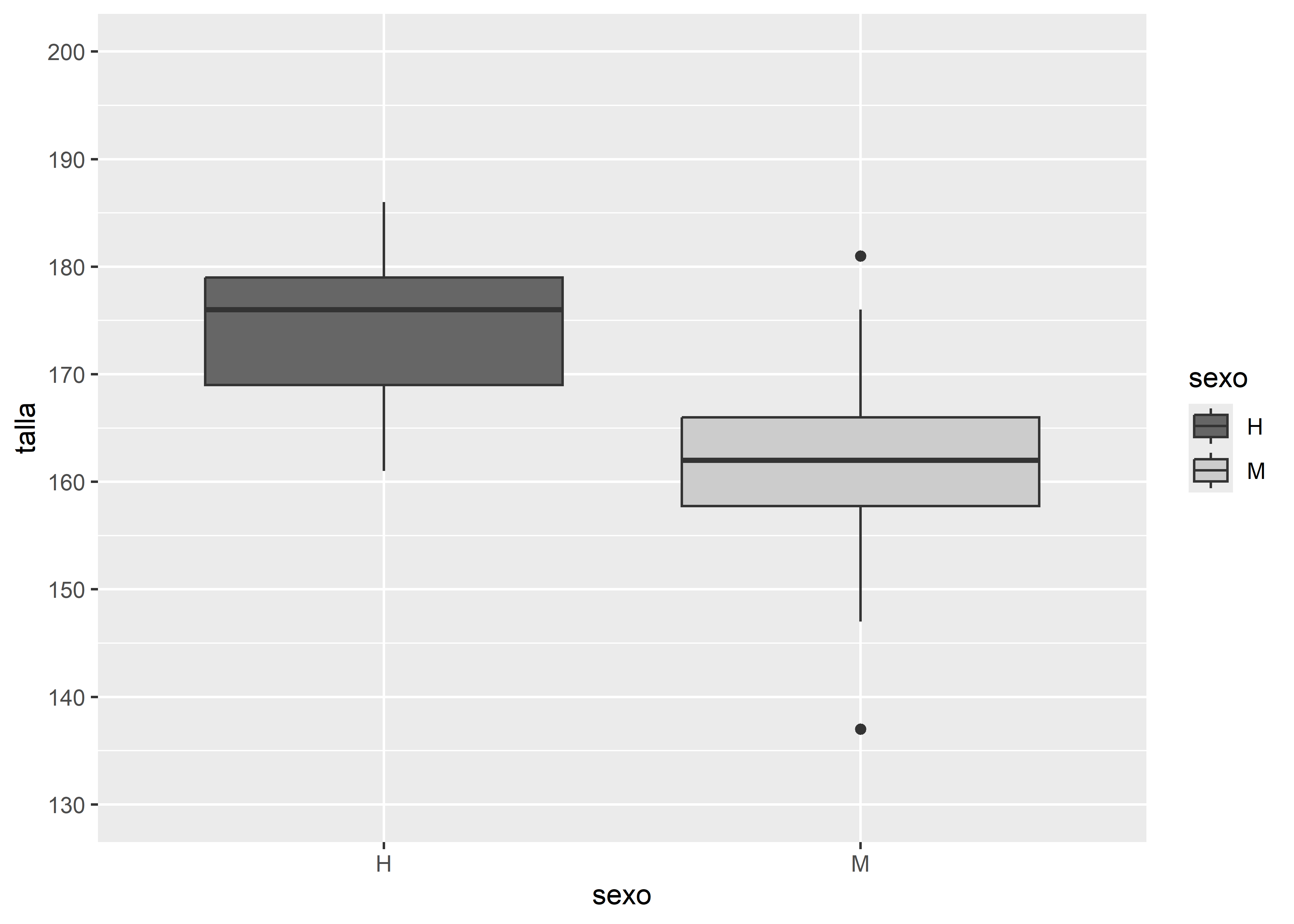 Por último, podemos personalizar los cortes del eje Y utilizando scale_y_continuous(). Por ejemplo, en el boxplot pintado en escala de grises, definimos que el eje Y comienza en 130cm y termina en 200cm, con cortes cada 5cm y etiquetas cada 10cm: