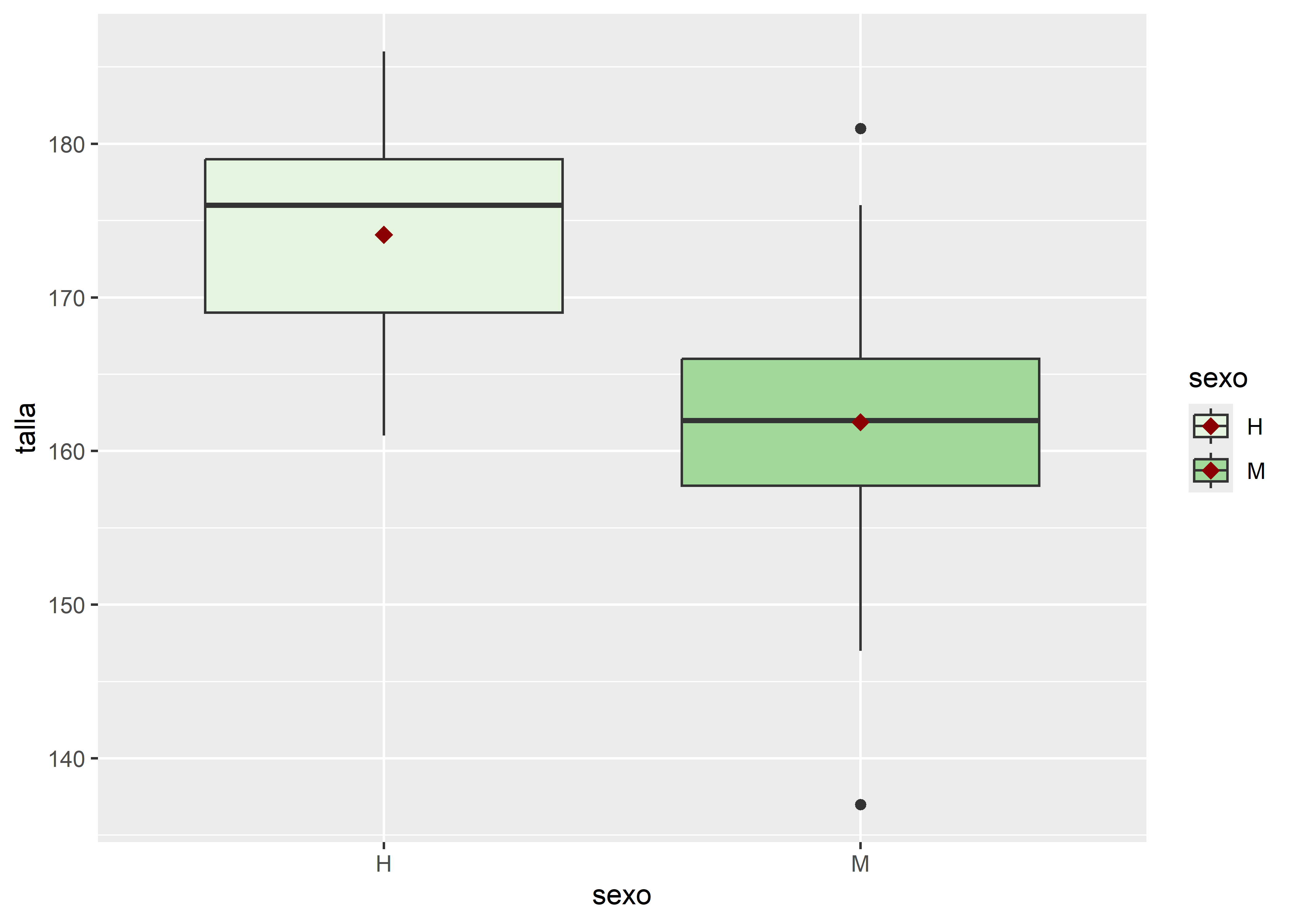La función stat_summary() permite aplicar funciones estadísticas como mean, median, sd, entre otras, y representar el resultado con un objeto geométrico, en este caso geom = "point". En el gráfico, la media de talla se muestra con un punto rojo oscuro (color = "darkred"), de forma romboidal (shape = 18) y tamaño ampliado (size = 3).