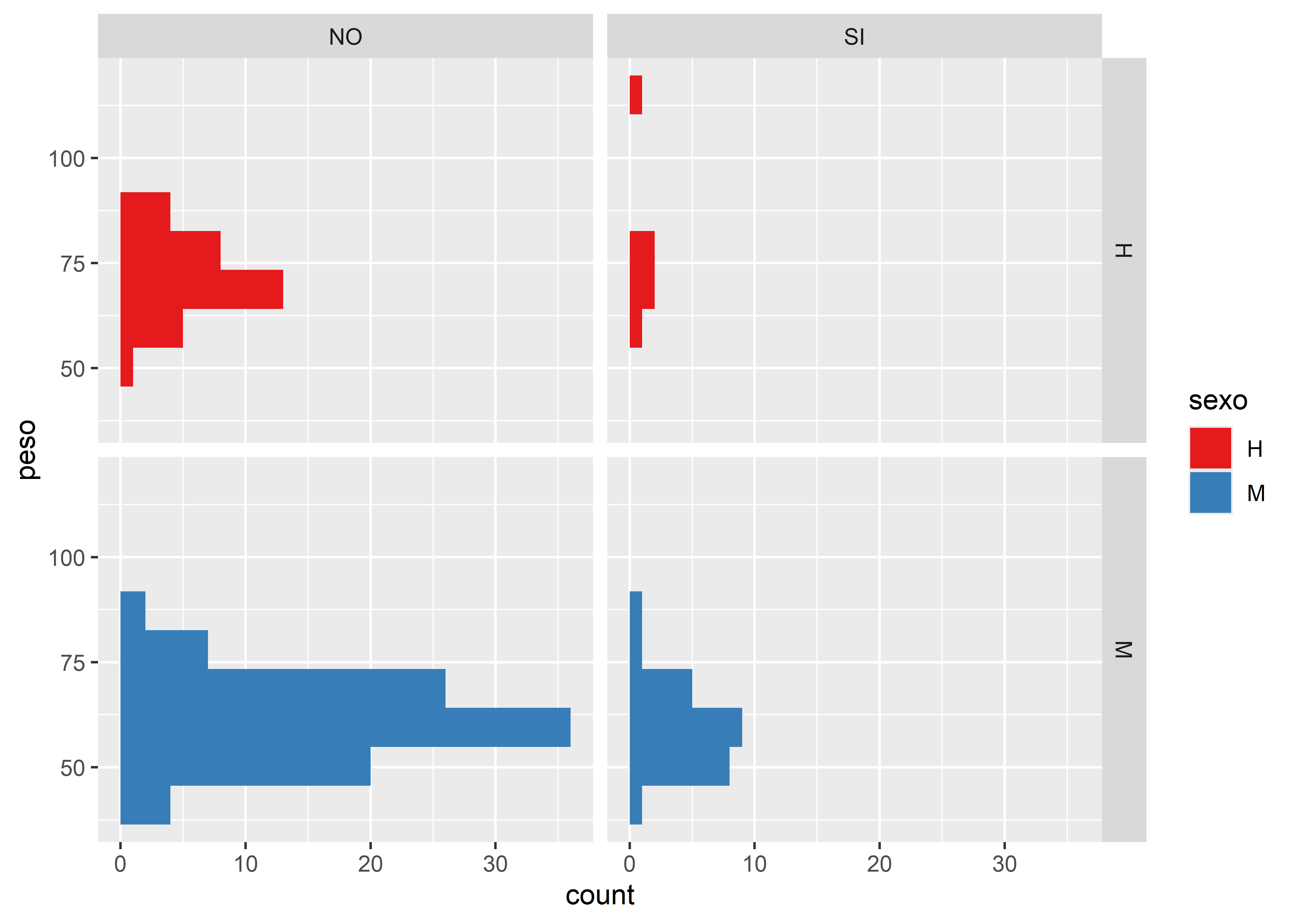 Usaremos facet_grid() para crear una matriz de histogramas producto del cruce de las variables fuma y sexo. Dentro de la cuadrícula graficaremos histogramas de la variable peso coloreados por sexo: