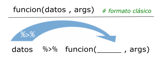Una de las incorporaciones más útiles y transversales del ecosistema tidyverse es el uso de “tuberías” o pipe operators. Una tubería conecta un bloque de código con otro, permitiendo encadenar operaciones de manera legible. El operador %>%, proveniente del paquete magrittr (Bache y Wickham 2022), transforma llamadas de funciones anidadas (con múltiples paréntesis) en una secuencia de pasos más simple de leer y escribir.