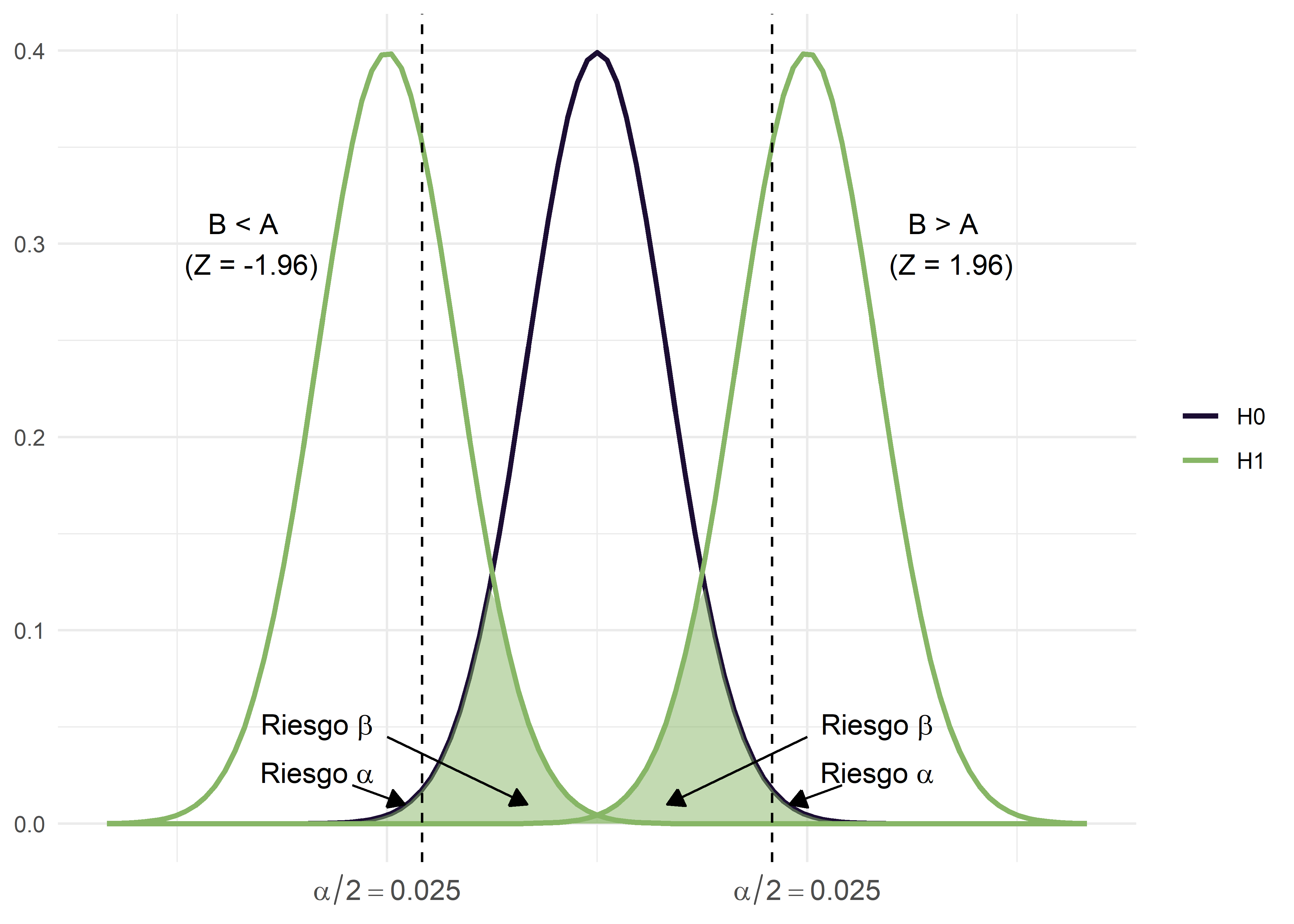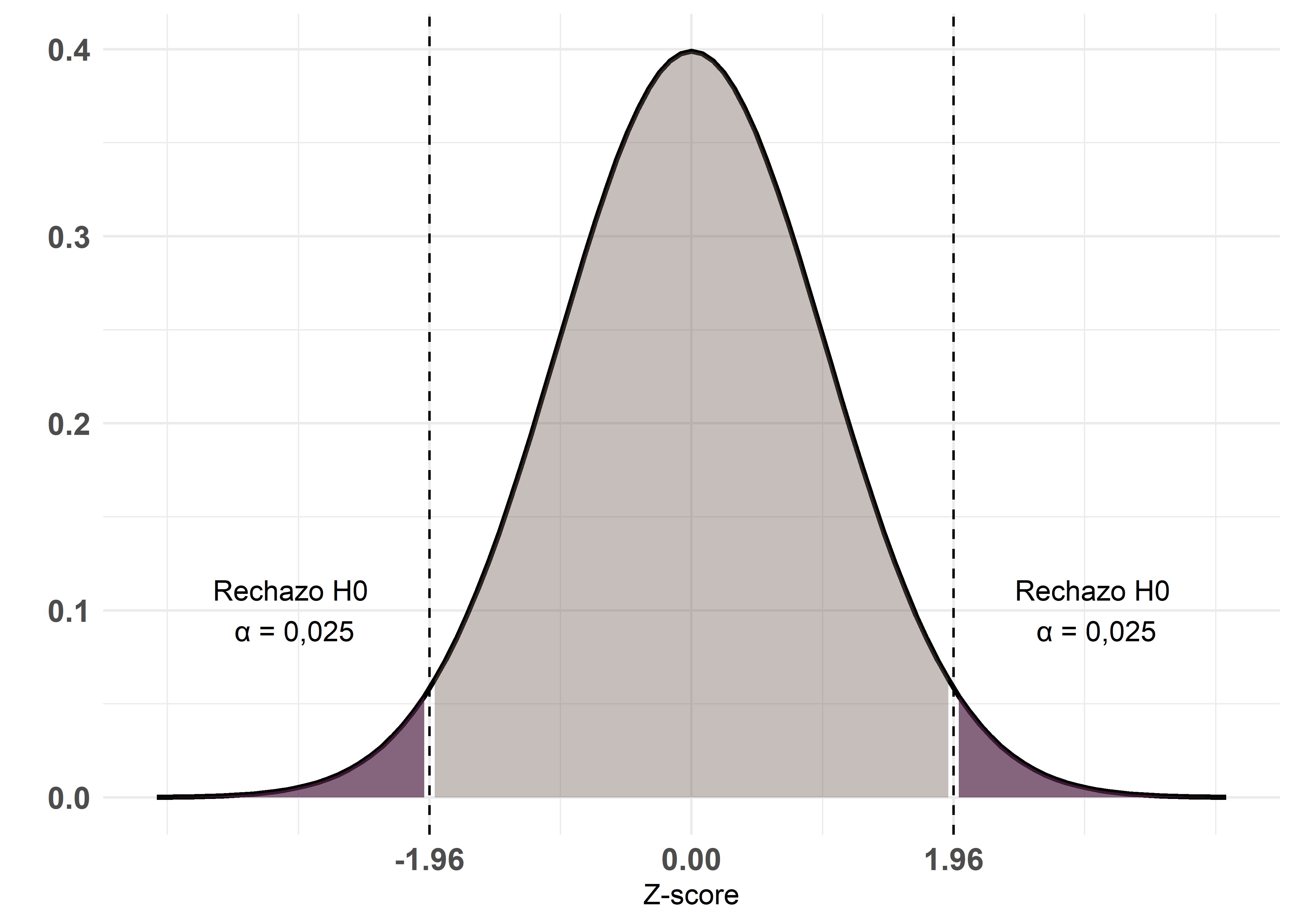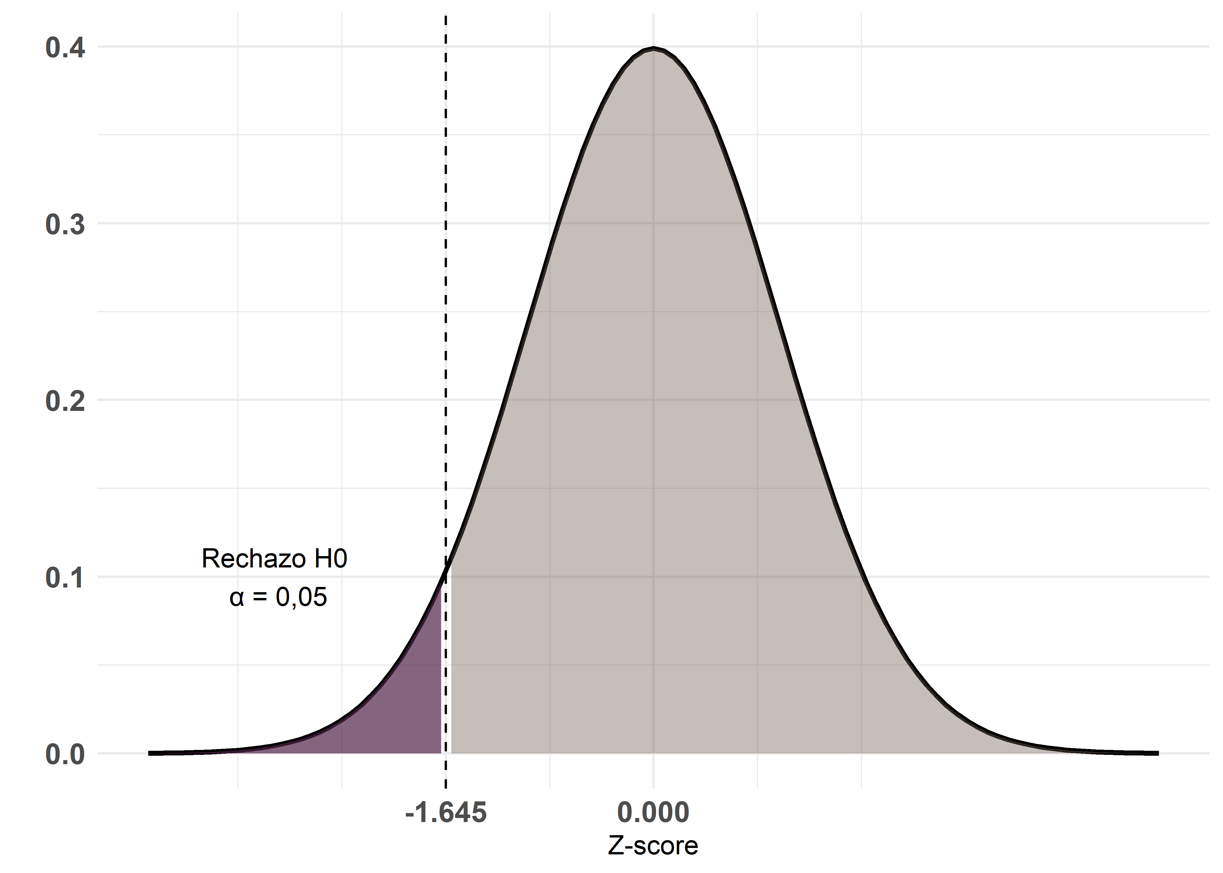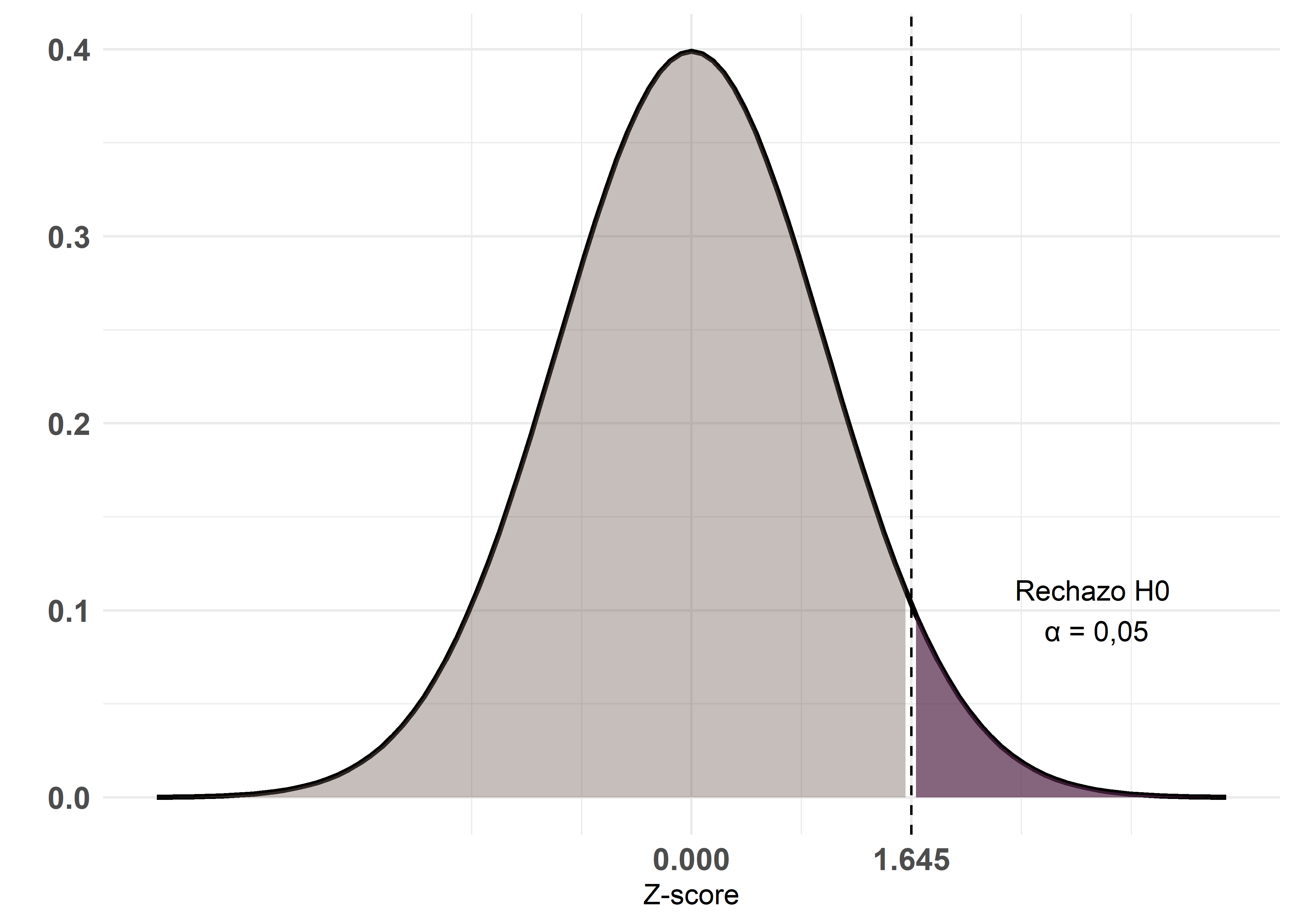 Estadístico de prueba: Es el valor calculado a partir de los datos muestrales que se utiliza para tomar la decisión sobre la \(H_0\). Cada tipo de problema tiene un estadístico adecuado, cuya magnitud, al compararse con su distribución muestral (por ejemplo, la distribución normal estándar en el caso del estadístico \(Z\)), permite determinar si las diferencias observadas son atribuibles al azar.