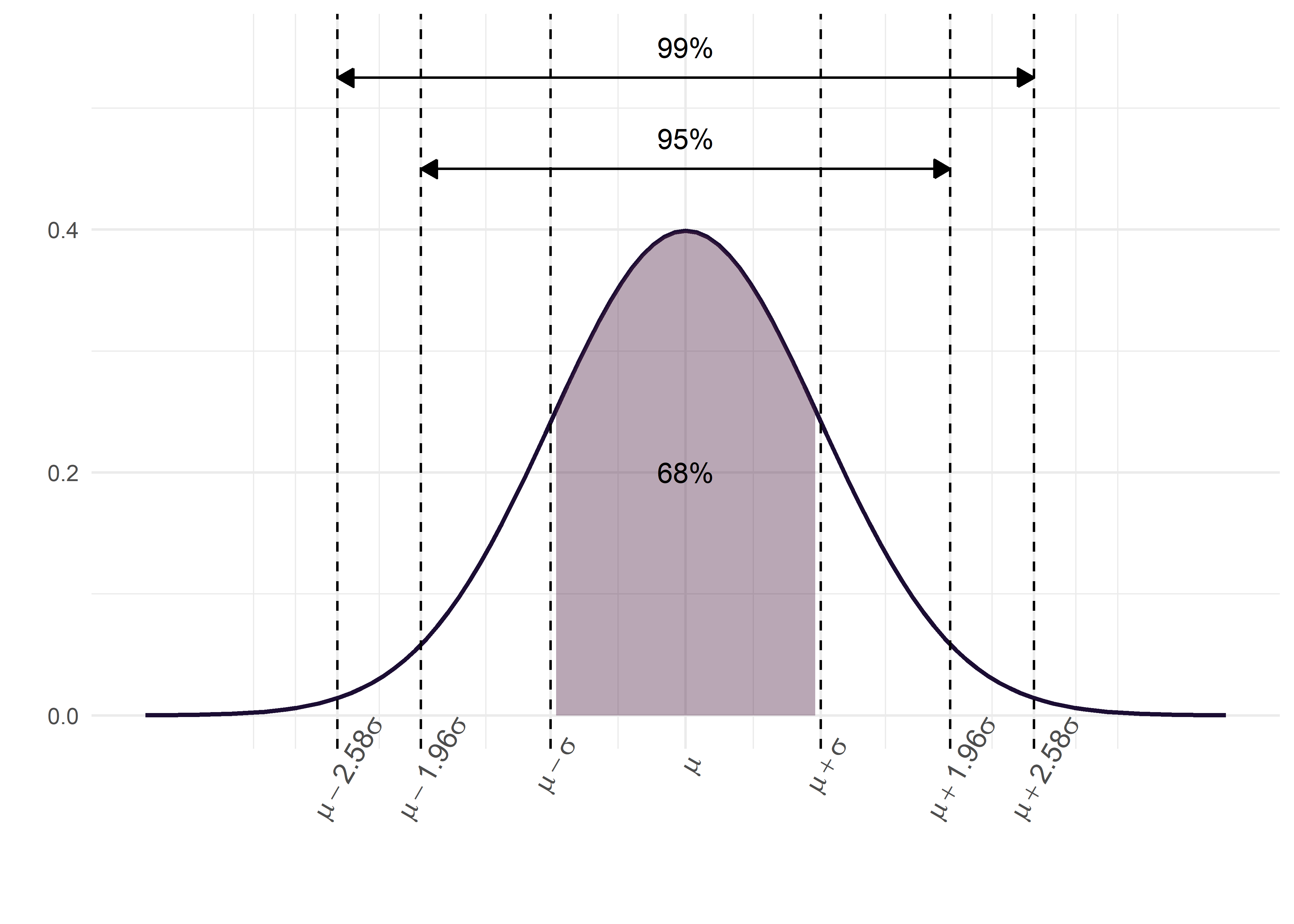 Entre \(\mu \pm \sigma\) se encuentra el 68% de los datos.