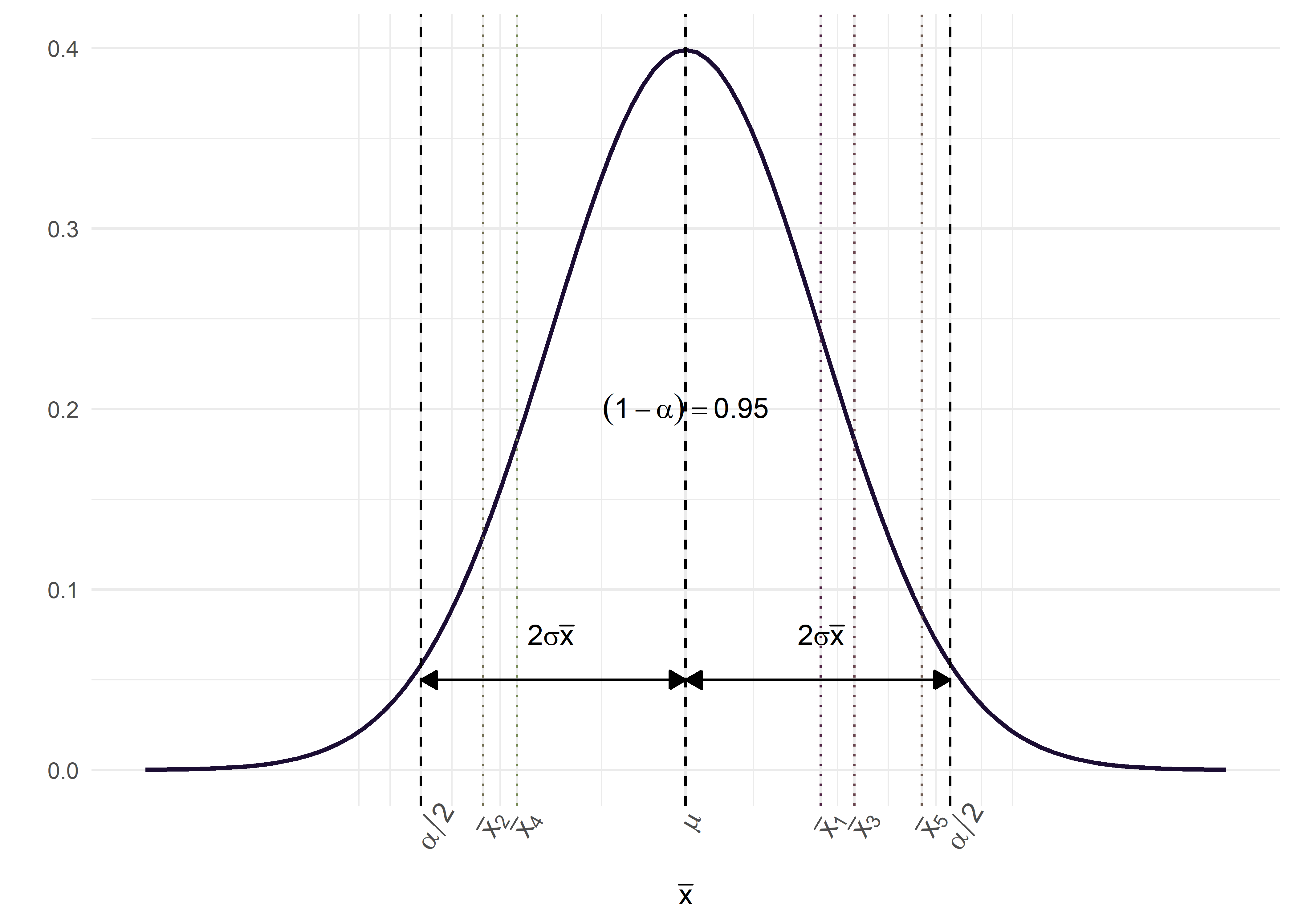 Si hubiésemos tomado múltiples muestras del mismo tamaño de la población, en al menos \(100 * (1 − \alpha)\%\) de las ocasiones el intervalo calculado contendría el parámetro poblacional real. Es decir, un IC al 95% implica que, a largo plazo, el 95% de los intervalos obtenidos a partir de muestras repetidas incluirán el valor verdadero del parámetro.