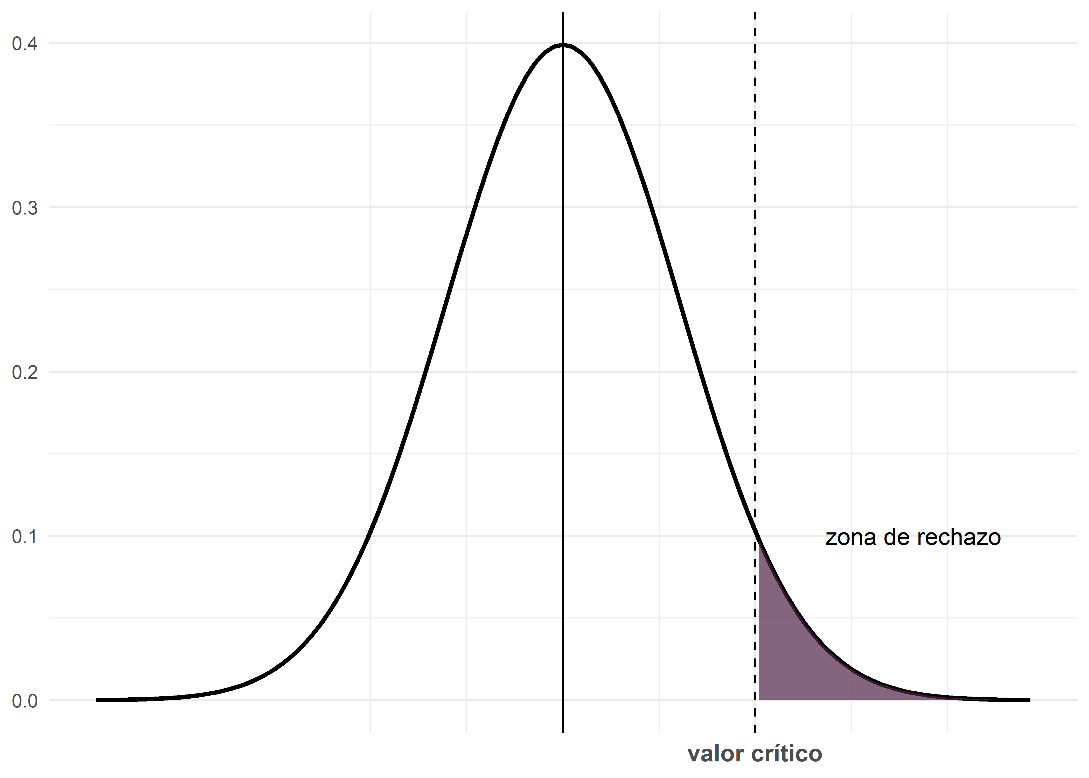 Valor crítico o Región crítica: La región crítica se establece en función del nivel de significación (\(\alpha\)) y consiste en el conjunto de valores extremos del estadístico de prueba que, de ser alcanzados, llevarían a rechazar la \(H_0\). Todos los posibles valores del estadístico se ubican en el eje horizontal de la gráfica de su distribución, y la región crítica delimita aquellos valores que son muy poco probables bajo la hipótesis nula.
