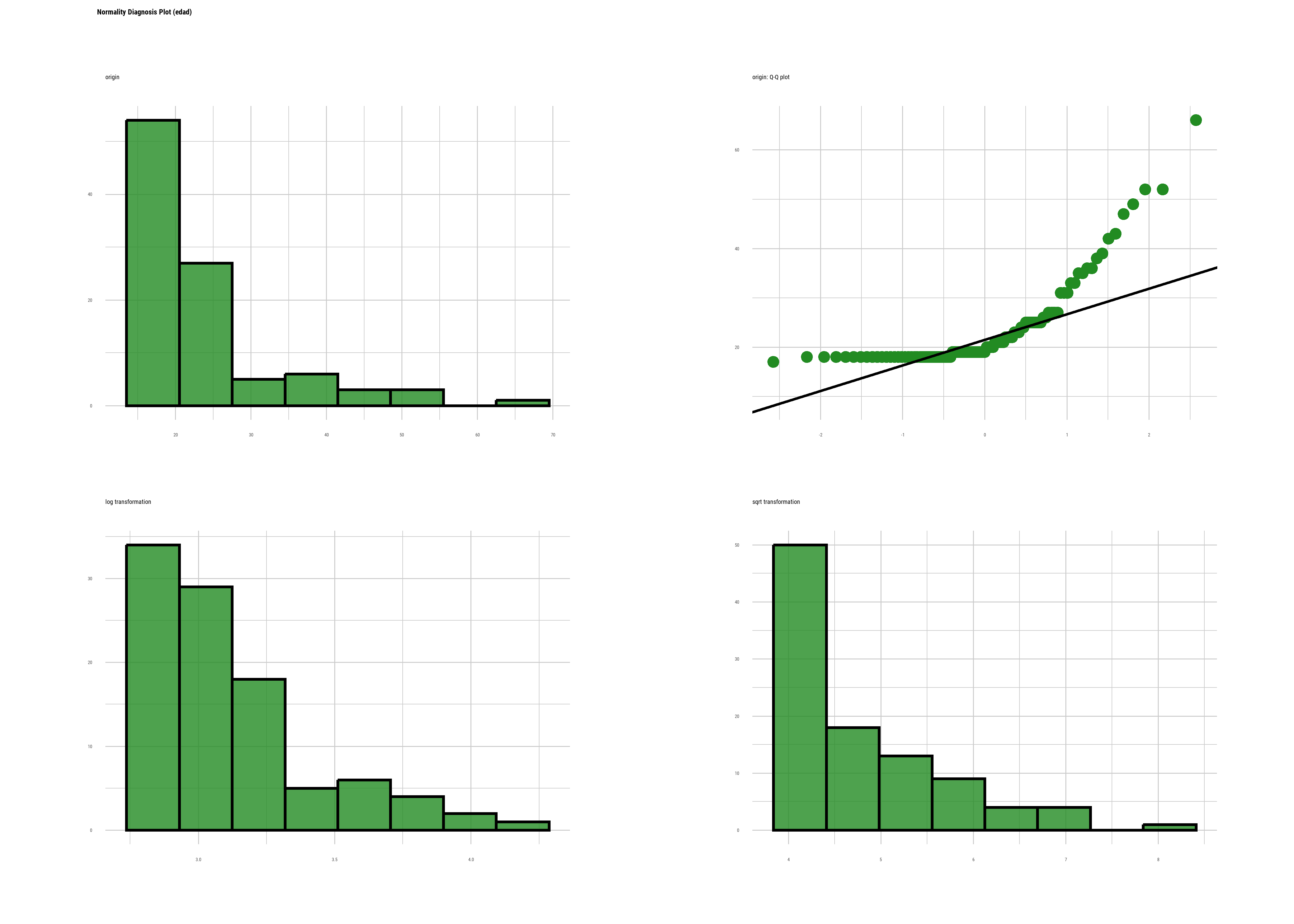 Observamos aquí las distorsiones sobre la media y las formas paramétricas que devienen de distribuciones asimétricas y alejadas de la curva normal. El código correcto para este caso (variable edad) es usar el centrado en la mediana (center = "median").