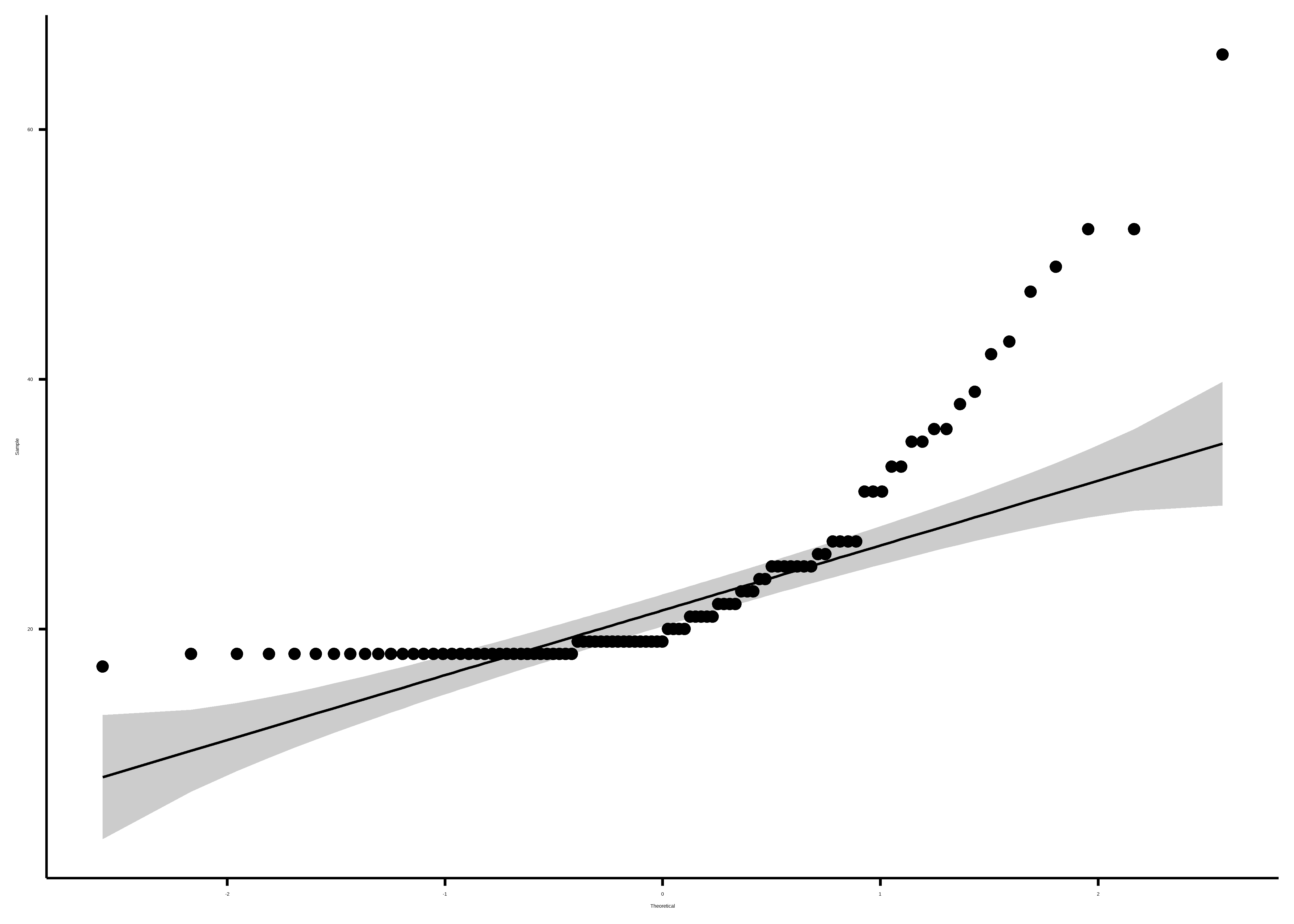 La función ggqqplot() del paquete ggpubr (Kassambara 2023) nos permite agregar intervalos de confianza (zona gris alrededor de la recta) que nos orienta mejor sobre “donde caen” los puntos de la variable analizada: