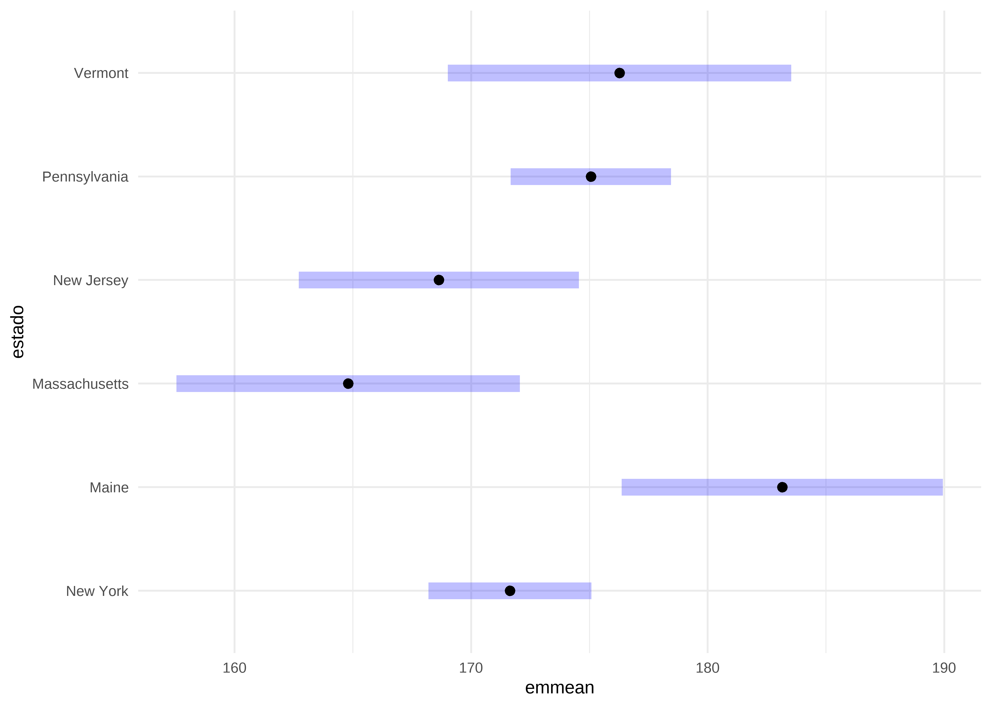 El paquete emmeans (Lenth 2025) es una herramienta muy versátil y poderosa para realizar comparaciones múltiples. Comenzaremos utilizando la función emmeans() con el argumento specs = "estado" para crear un objeto que contenga las medias marginales por grupo: