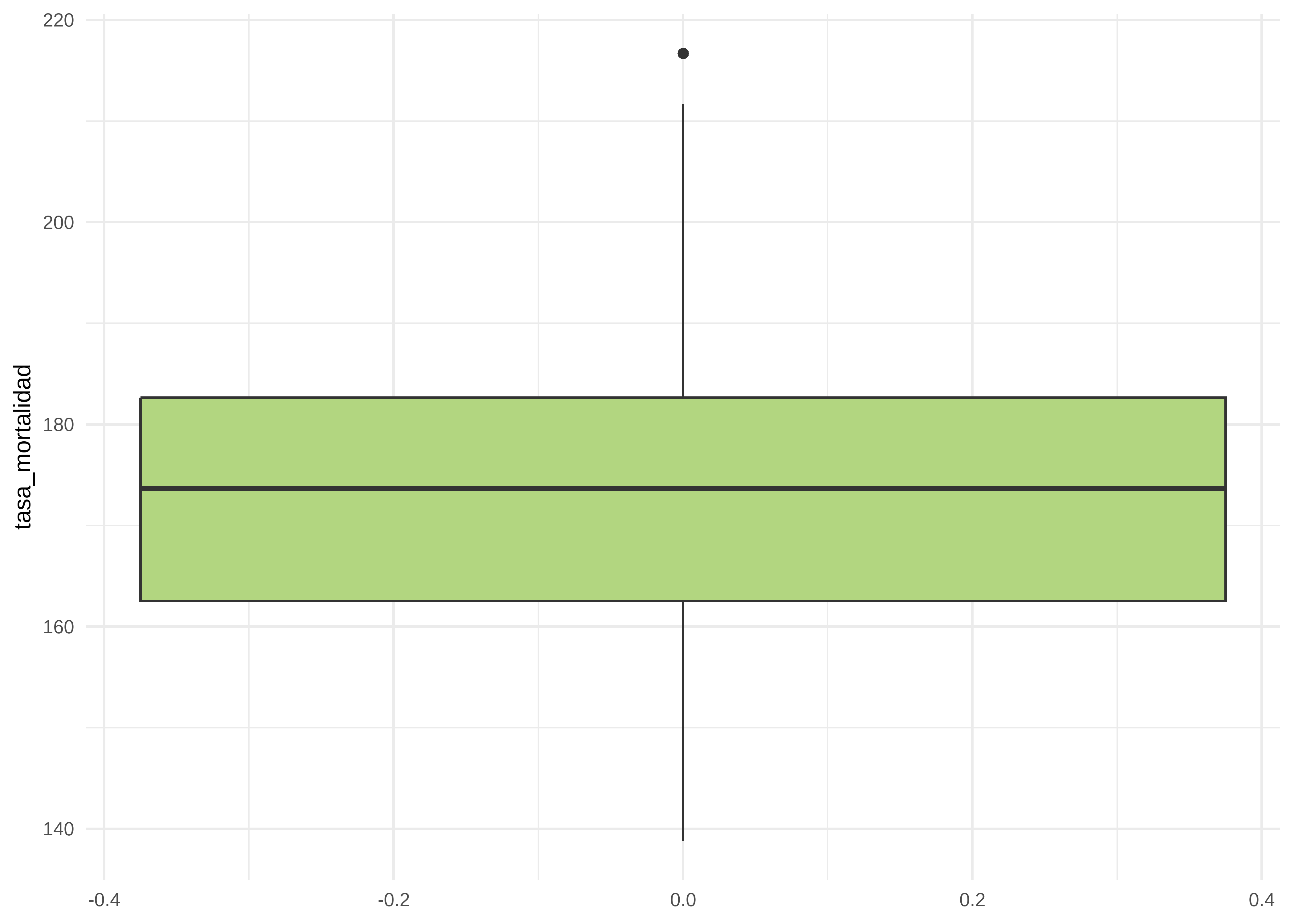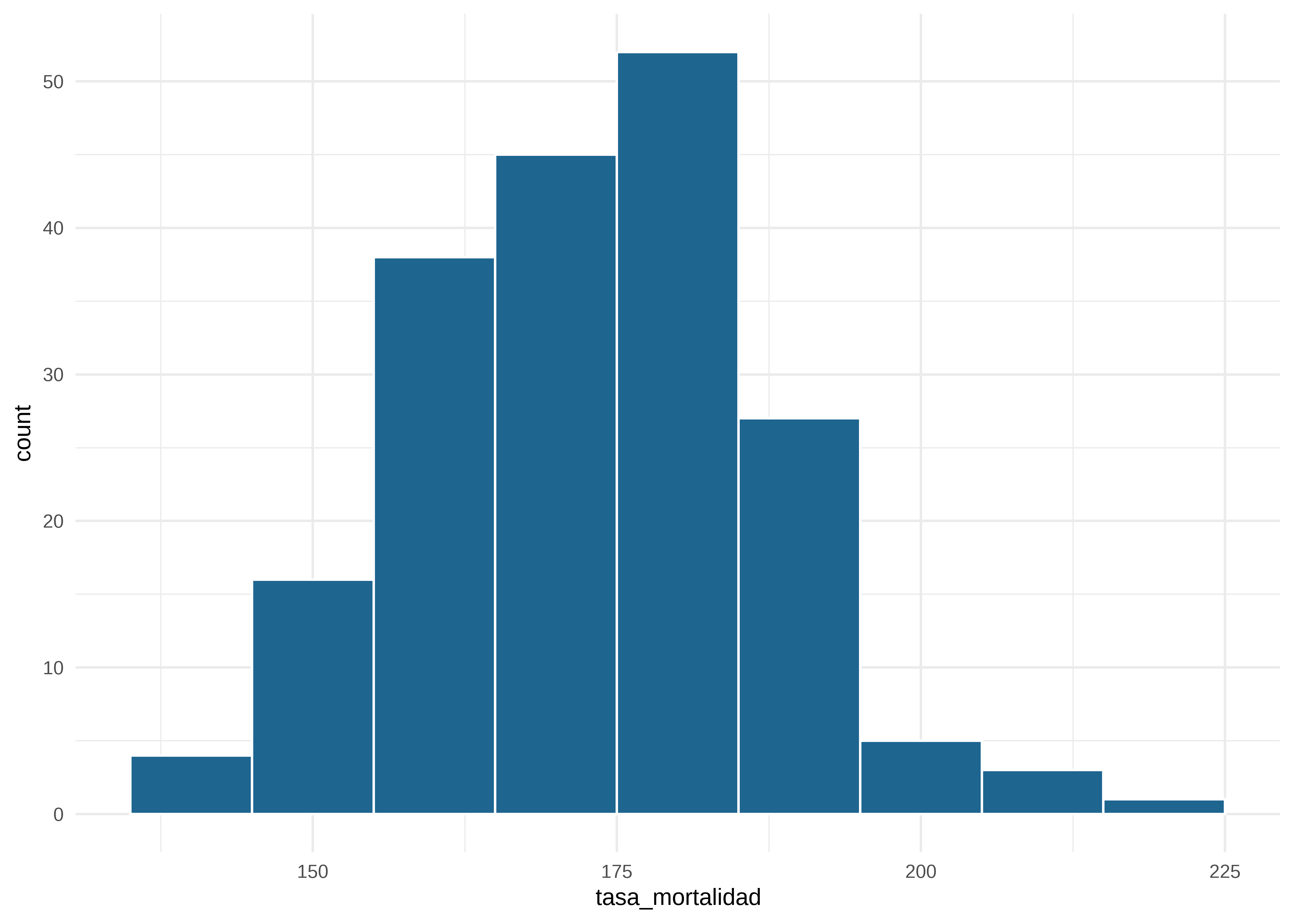 | tasa_mortalidad | 0 | 1 | 172.43 | 14.23 | 138.8 | 162.2 | 173.3 | 181.6 | 216.7 | ▂▆▇▃▁ |