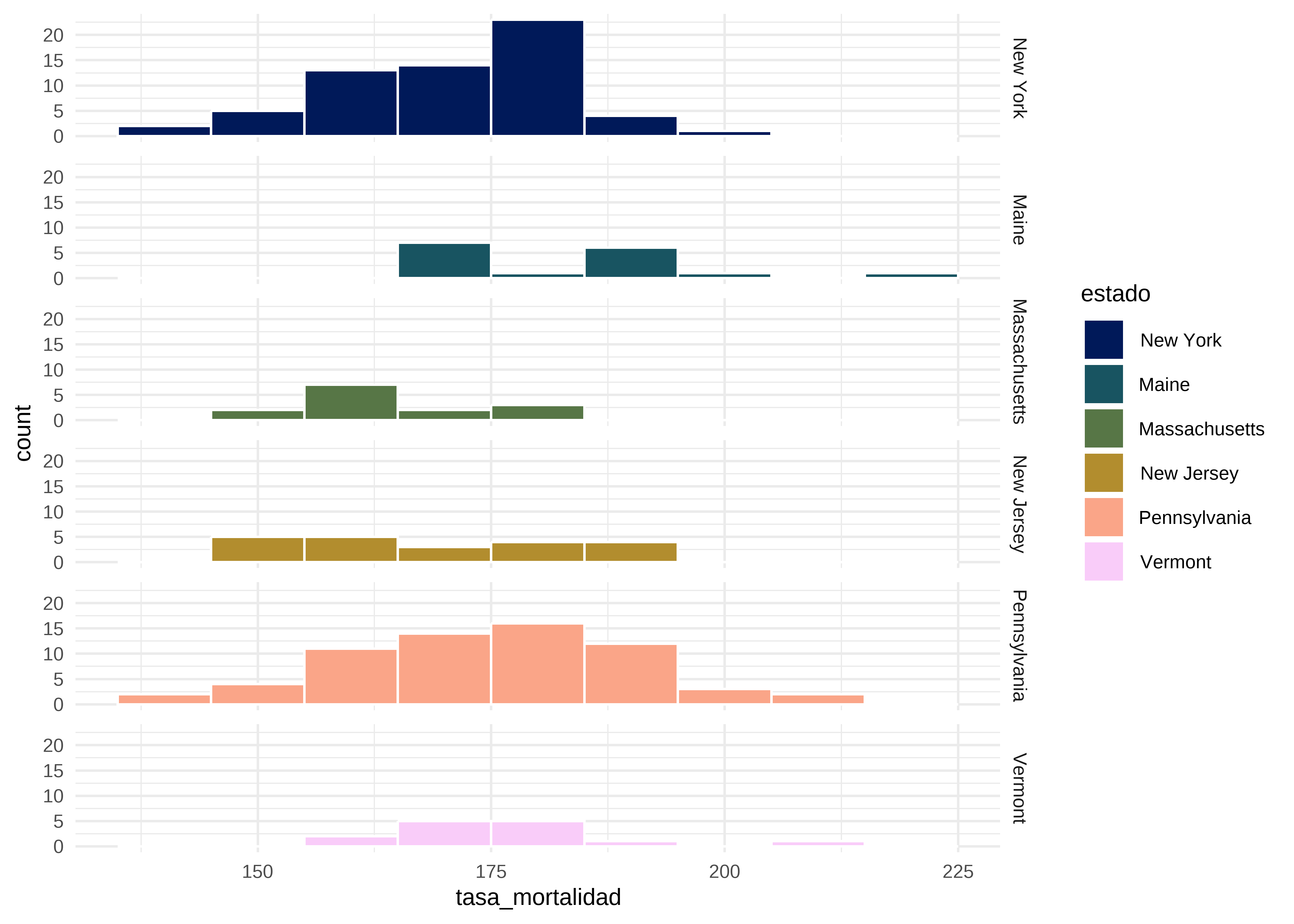 Los estados con menos observaciones (Connecticut, New Hampshire y Rhode Island) serán excluidos para evitar sesgos en el análisis. También convertiremos la variable estado a un factor ordenado con el comando fct_relevel() del paquete tidyverse: