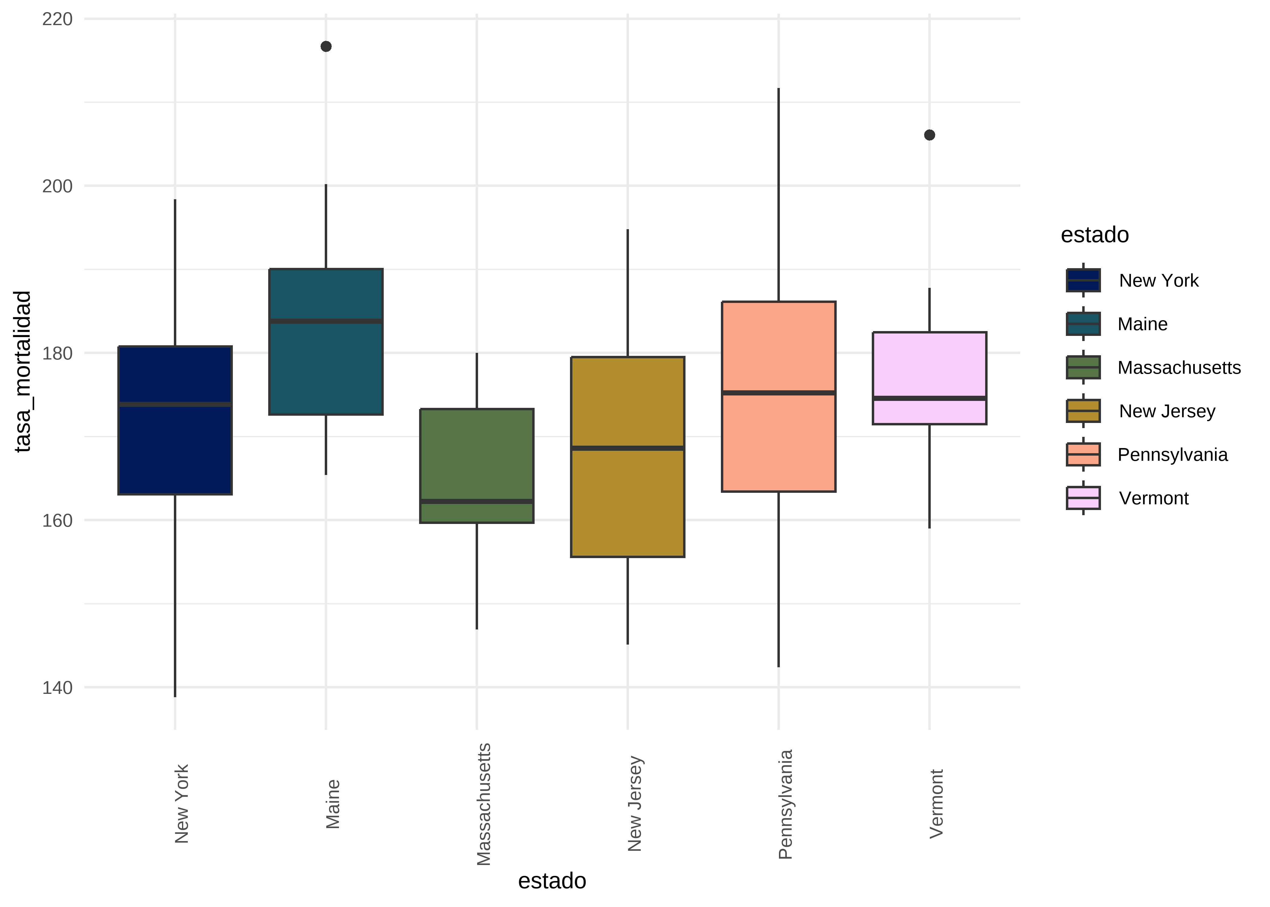Los resultados del test de Tukey nos muestran diferencias significativas en la tasa de mortalidad por cáncer en el estado de Maine respecto de New York, Massachusetts y New Jersey.