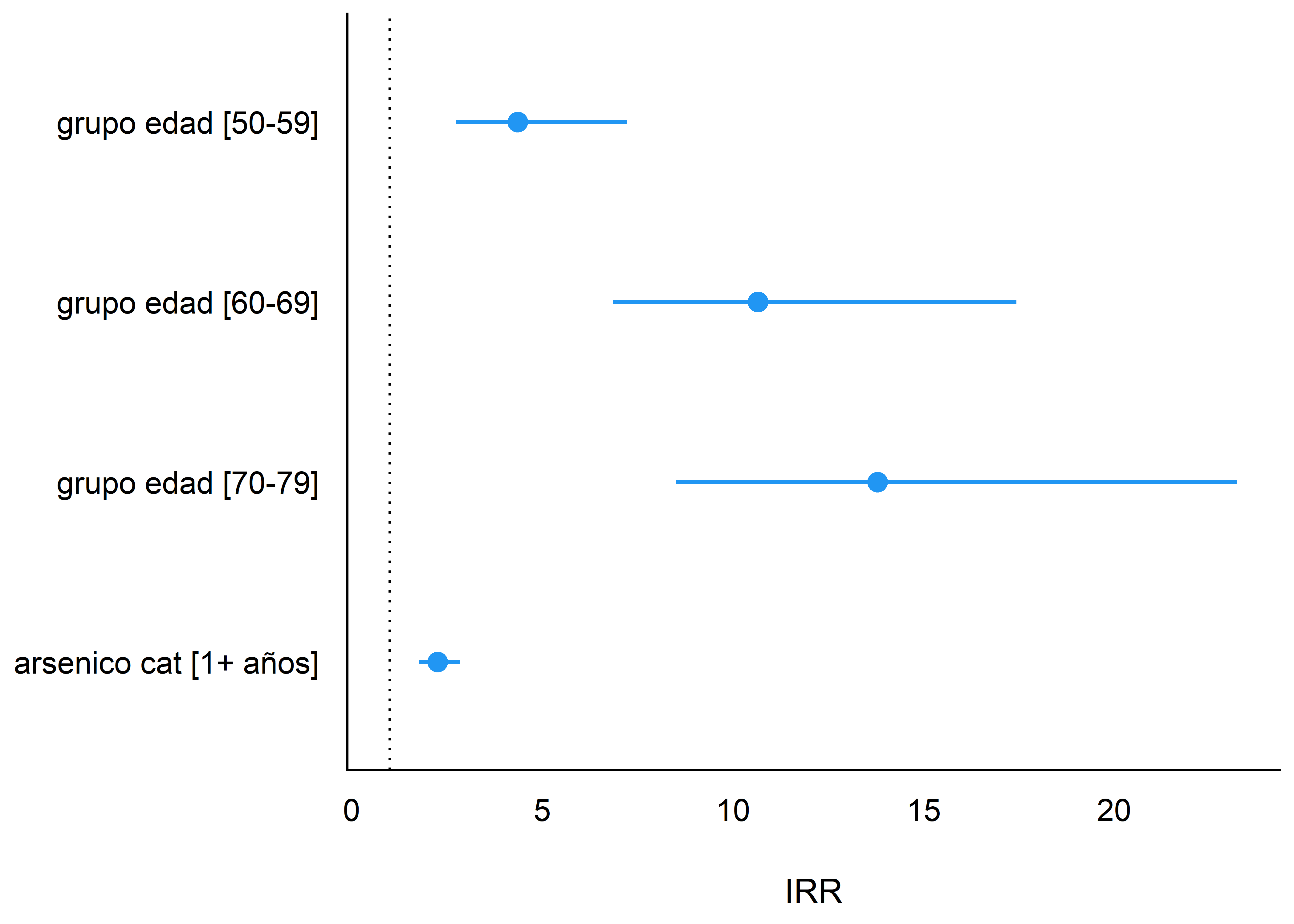 Traducidos a riesgo, mediante la exponenciación de los coeficientes, observamos que los diferentes categorías de años de exposición al arsénico no varían entre sí. Esto nos hace pensar que puede valer la pena agruparlo en solo dos niveles: